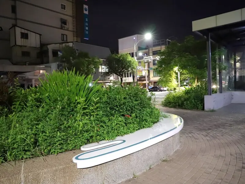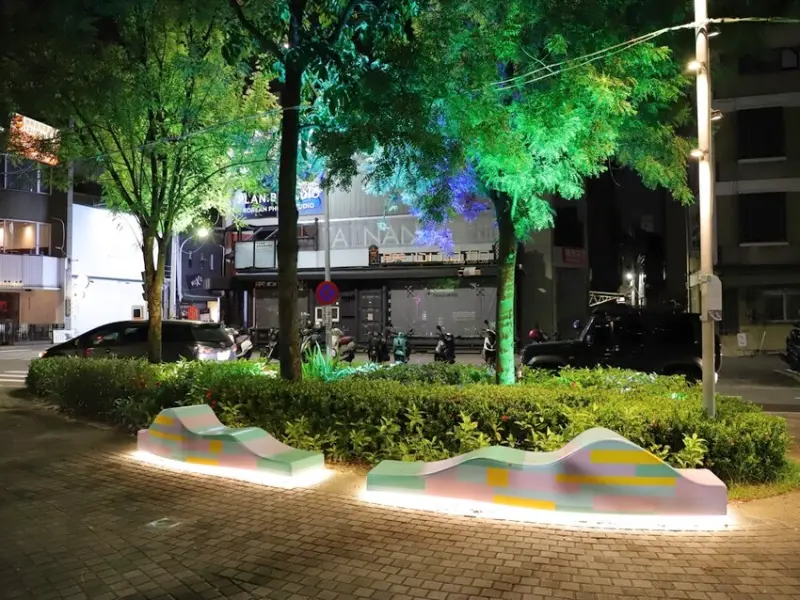 環繞花台的座椅用漣漪的意象呈現,描繪出台南的濕地水文。座椅上方是抽象的動畫角色和飛翔中的黑面琵鷺,這些元素象徵著它們從濕地出發、穿越時空,從海安路的歷史和現在飛向未來。這幅充滿動感和想像力的超現實濕地風景,不斷在台南的每個角落流動延續著,展現了這個城市的不斷變遷和永續發展。