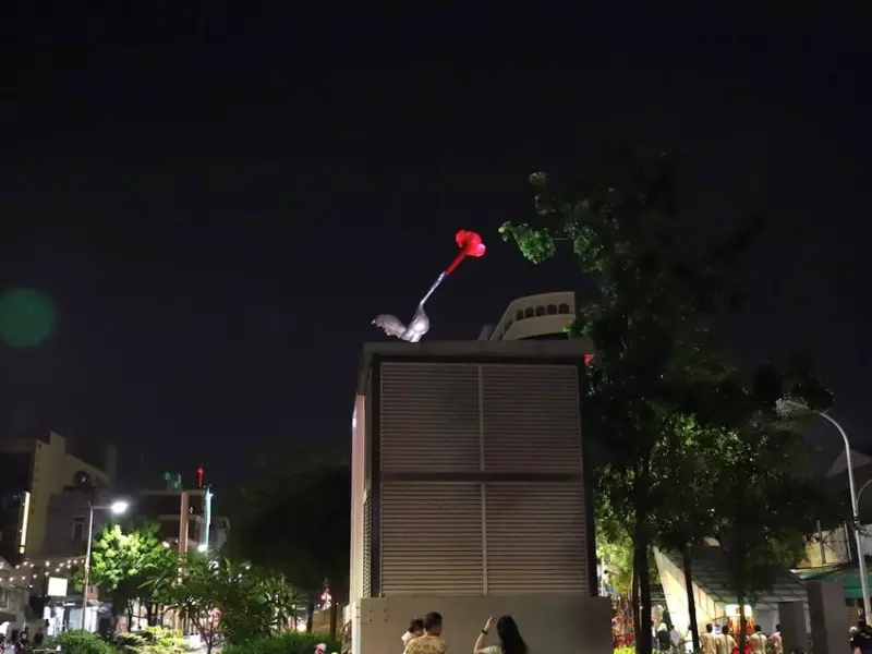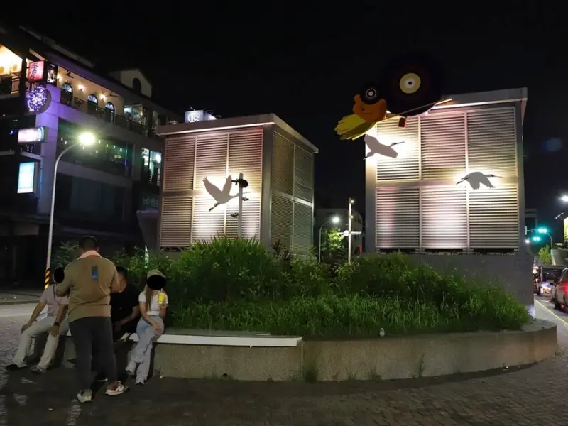 「喉光普照」是藝術家梁任宏創作的裝置藝術。設計概念是像「鐵公雞」一樣隨風轉動「跳舞」,展現它很厲害的樣子。這個藝術品從2018年就一直在這裡了,已經六年多了,根本變成這個區域的地標了!作品對面就是水仙宮市場,象徵著一大早從雞叫開始,菜市場就充滿活力,人潮滿滿。