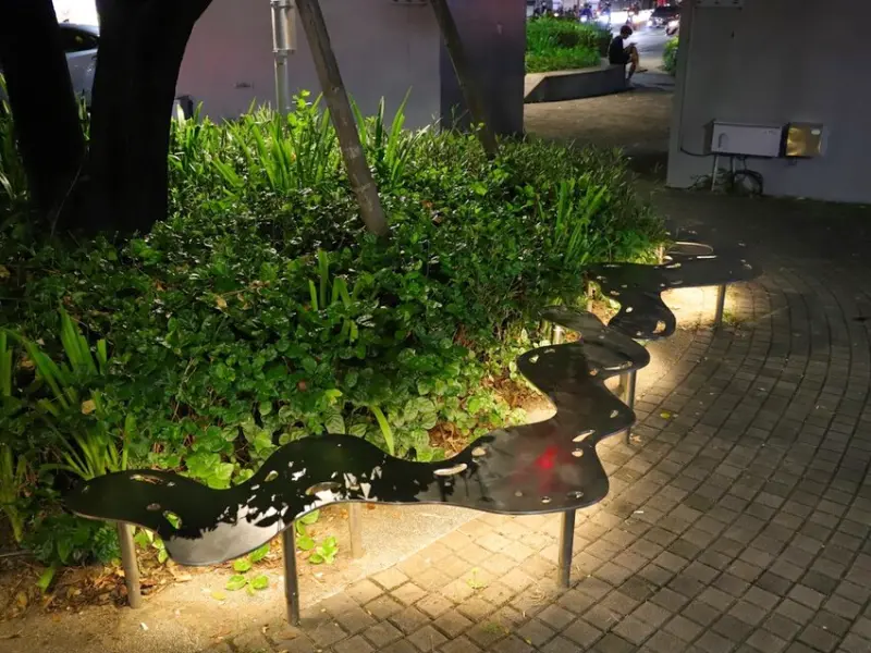 四百年前,這裡曾是台江內海的一片汪洋,現在已經變成店家林立、人潮眾多的海安路。作品召喚海的水域記憶,手工打磨的綢絲紋不鏽鋼椅面,就像內海一樣圍繞著美麗的大樹,自由奔放的水流意象,呼應海安路的水文歷史,聚集並濃縮了台南四百年的時光。這個作品邀請來往的人們停留在這片流水般的意象上,感受那美好的過去和現在。