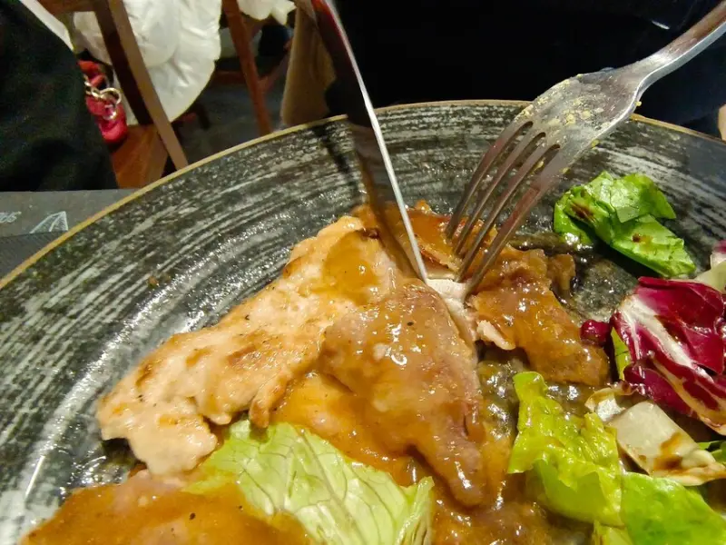斷面秀也拍個特寫,豬排的確挺薄的,不過看在好吃的份上就不計較了,畢竟我們期待的主菜還沒上桌呢!