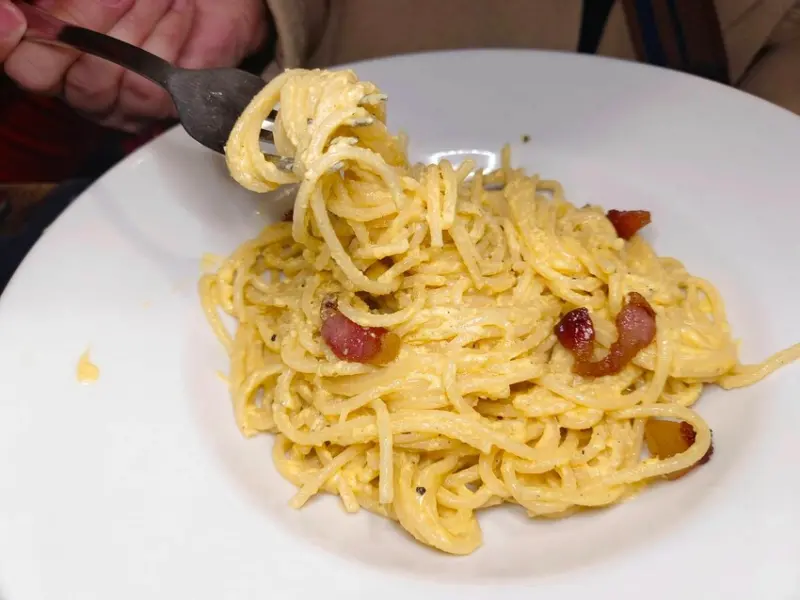 在義大利培根起司蛋麵被稱為Carbonara, 使用濃郁的蛋液以及新鮮起司粉來做醬汁,再搭配煎得酥脆的培根肉,吃起來相當濃郁又好吃