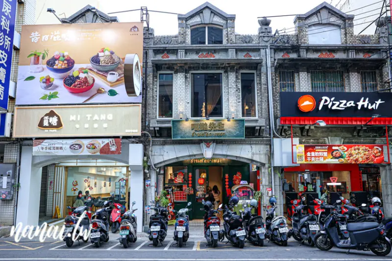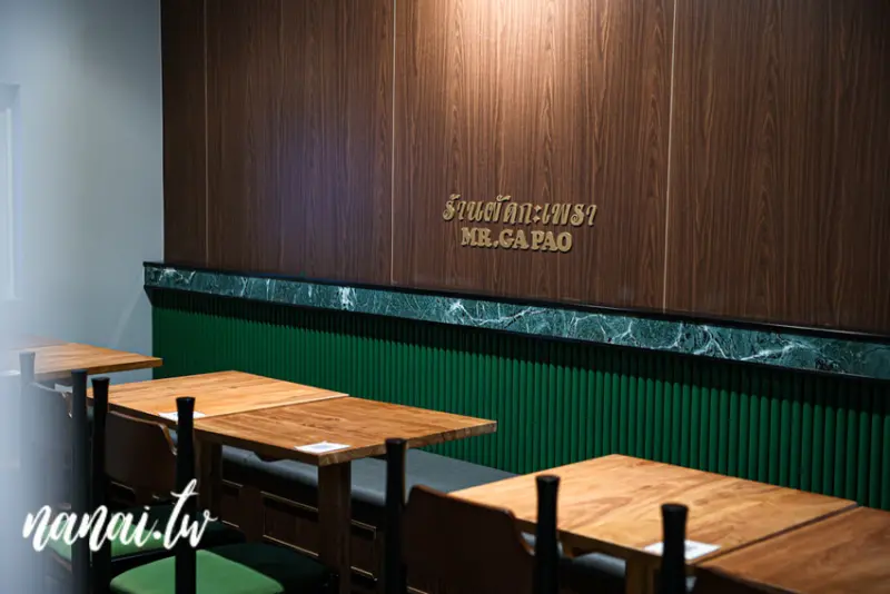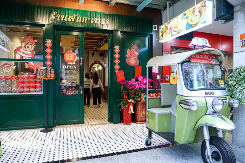 主廚來自泰國,門口更引進泰國嘟嘟車。墨綠色門面與復古白磁磚,彷彿步入曼谷街頭,濃濃異國風情,讓更多人享受道地泰式打拋豬!