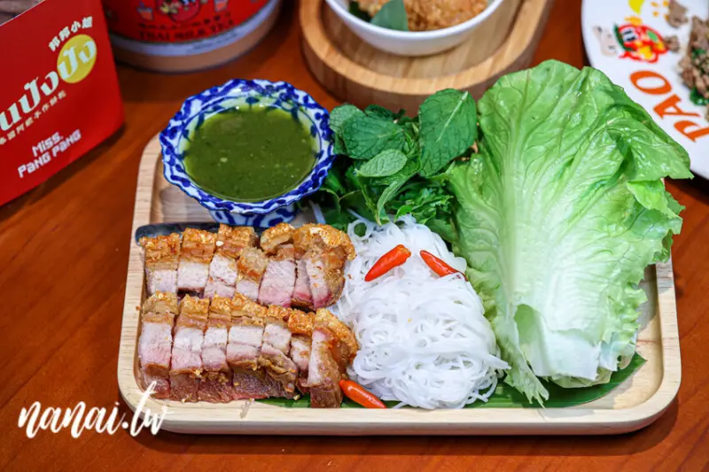嘎拋先生的獨家超泰吃法,每日限量,晚來可就吃不到!嚴選三久無毒豬五花肉,製作過程相當費工,光是半成品就需先烘烤再風乾兩天。出餐前搭配新鮮生菜、特製海鮮醬、米線、薄荷與香菜一起享用,脆皮豬的外皮超酥脆,肉質彈牙有嚼勁,佐上酸辣帶勁的海鮮醬,與清爽的米線與生菜相互交織,滋味豐富,讓人一吃就愛上。