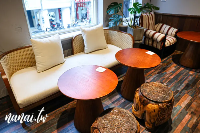 這個座位可以眺望窗外車水馬龍,搭配木編沙發椅和大象木雕椅,彷彿瞬間進入泰國的異國錯覺。