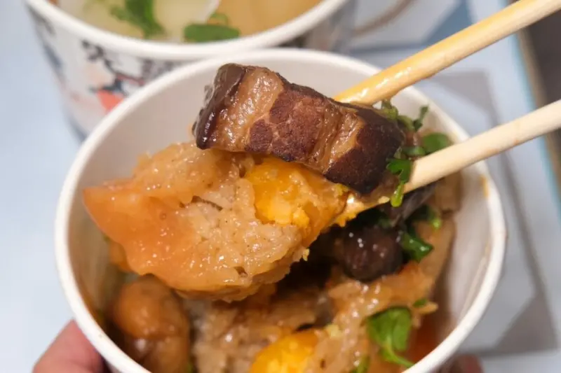 ▼現蒸的香噴噴峨嵋肉粽,給料相當大方,裏頭能吃到控肉、蛋黃跟香菇等食材,糯米香Q不黏膩,充滿了粽葉的香氣~