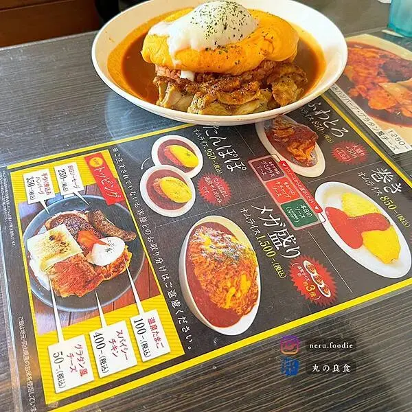 巻きオムライス 850円+チーズ 50円+温泉たまご 100円|たんぽぽオムライス 950円+スパイシーチキン 400円