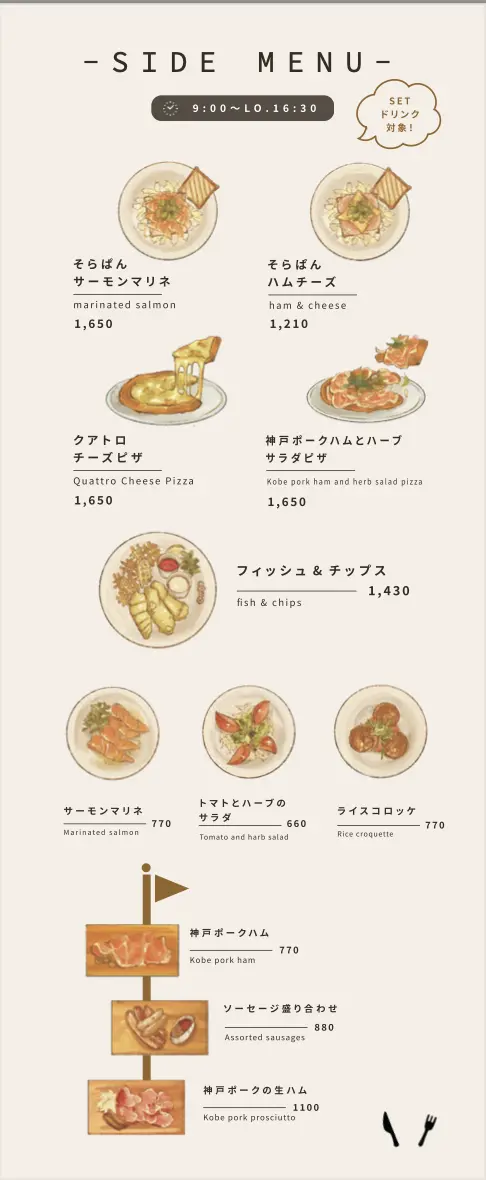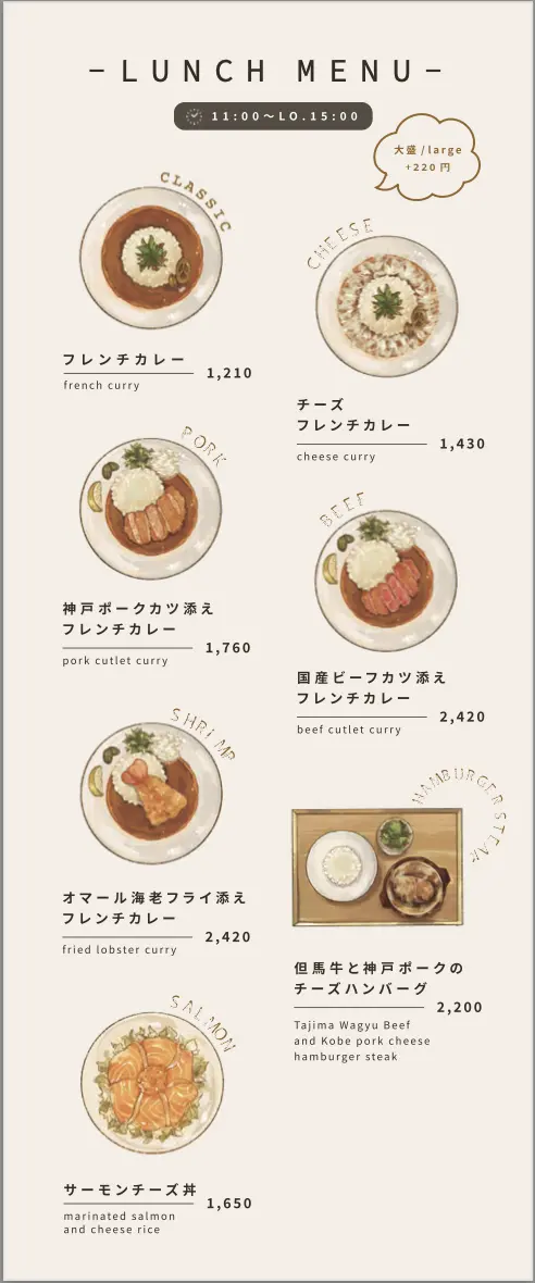 SOLA CAFE的菜單非常可愛,是插畫風格的菜單,店內提供咖喱飯、早午餐、甜點、飲品,我推薦大家一定要來吃午間菜單,供應時間是11:00-15:00,可以吃到CP值超高的炸龍蝦咖哩飯,整個是整尾龍蝦尾巴,這樣一份竟然只要日幣2420元,真的太強了呀!