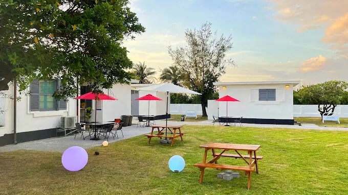 高美燈塔園區其實是以前的員工宿舍,目前規劃了一間雙人套房,一間四人親子房和五間青旅雅房,每棟房間外都有大大的數字號碼做識別,宿舍中間的大片綠草地,還有戶外野餐桌椅讓大家休息