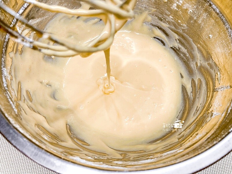 完成的蛋黃糊用打蛋器拉起會有堆疊感的稠度
