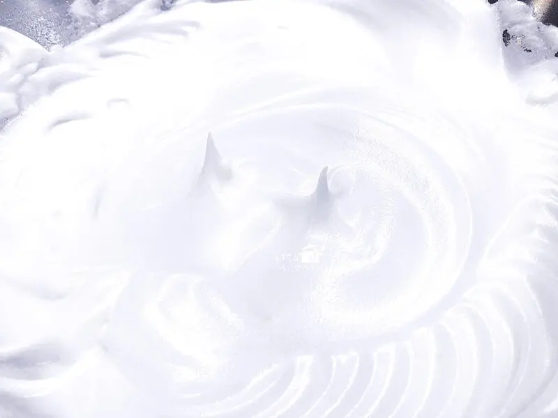 蛋白霜有明顯紋路,拉起攪拌棒會有堅挺的尖峰,轉低速再打幾秒調整蛋白氣泡加強蛋白霜的穩定性