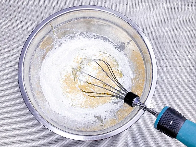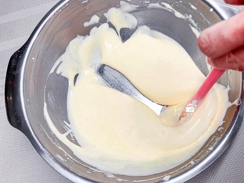 先用蛋抽大面積的混合後再用刮刀由盆邊及底部翻起檢查,麵糊要完全混勻到看不到白塊的蛋白霜