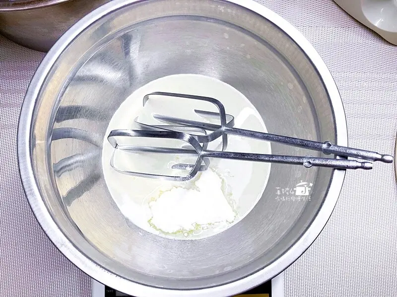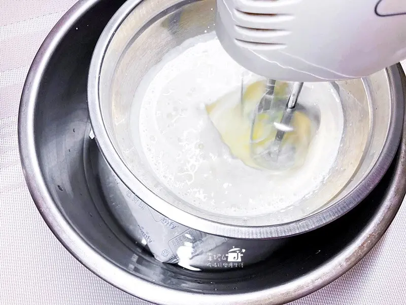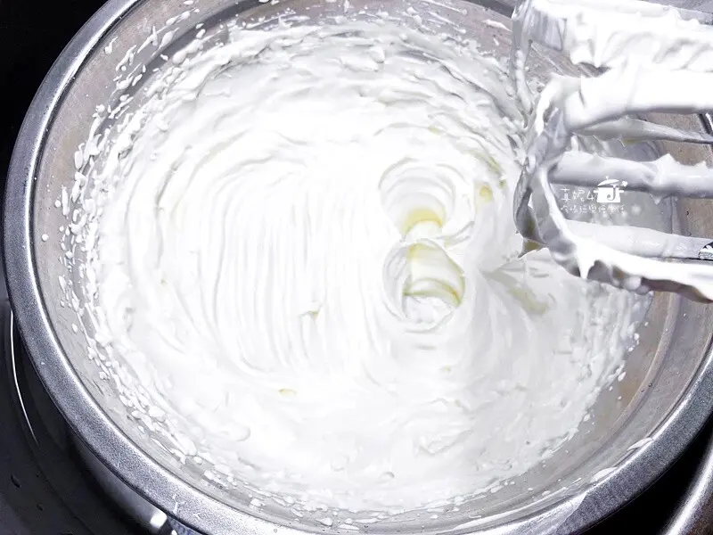 9.鋼盆外放冰水,鮮奶油加糖打發到出現紋路