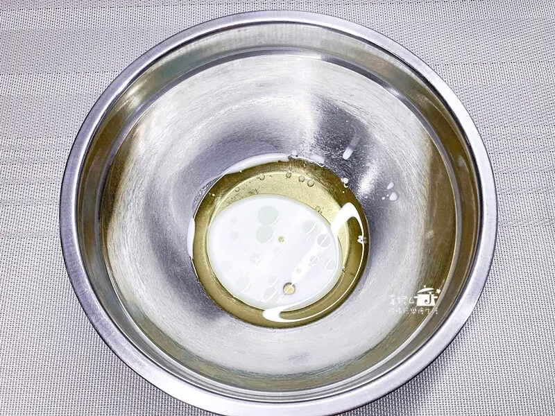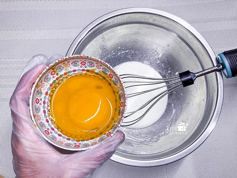 1.鋼盆裡加入牛奶和玉米油用打蛋器攪拌到融合後加入蛋黃繼續拌勻