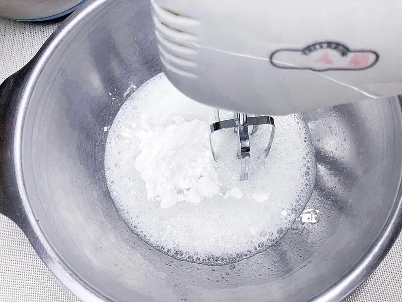 3.蛋白裡加入糖和幾滴白醋(或檸檬汁),電動攪拌機先高速打出大氣泡再轉中速把蛋白打發到乾性發泡的狀態