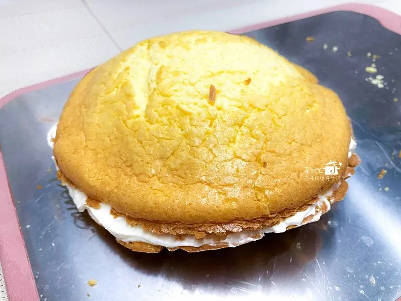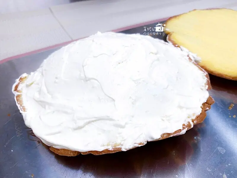 11.底層的蛋糕片先均勻抹一層鮮奶油,在蛋糕片的中心堆高鮮奶油然後往週圍均勻的推展出一個山丘的弧度,蓋上另一片蛋糕片,用手輕輕地壓緊讓鮮奶油和蛋糕體貼合,放冰箱冷藏讓鮮奶油收凍