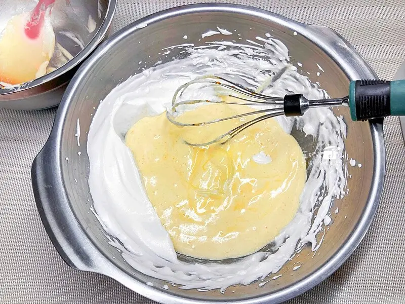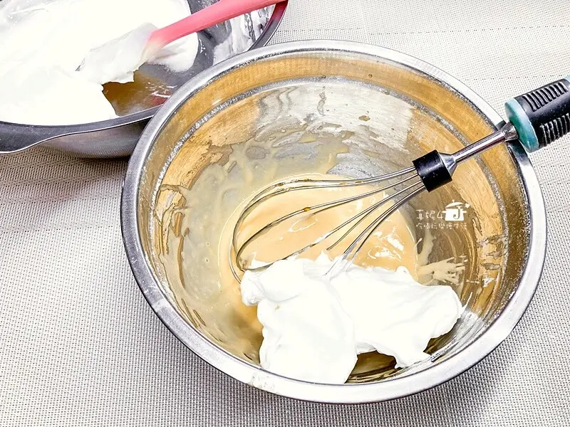 4.蛋白霜分次加入蛋黃糊裡攪拌拌均勻,混拌的動作要快而輕盈避免蛋白消泡