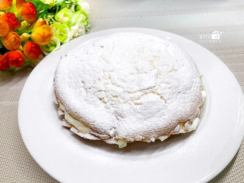 12.用最細網篩裝一大匙糖粉,用湯匙輕敲網篩,讓糖粉均勻灑落在蛋糕的表面