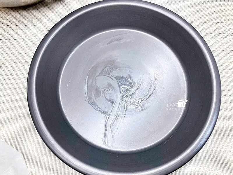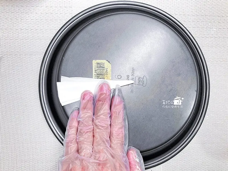 5.烘焙紙裁出烤模底部的尺寸,派盤裡擦抹一點點蛋糊固定底紙(方便脫模)