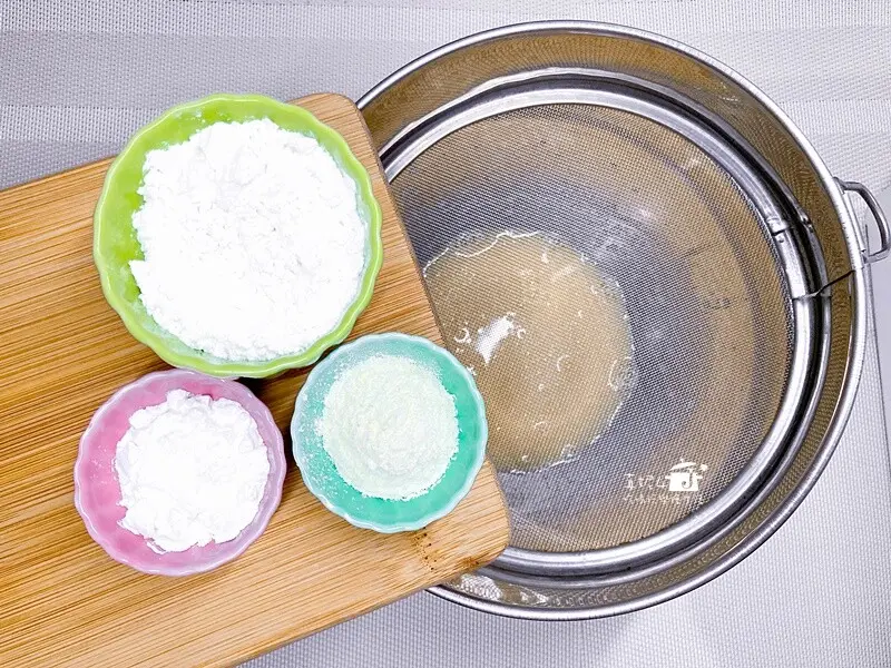 2.篩入低筋麵粉/玉米粉/奶粉,拌到看不見粉粒的狀態