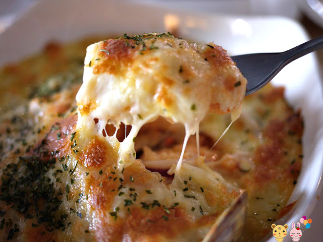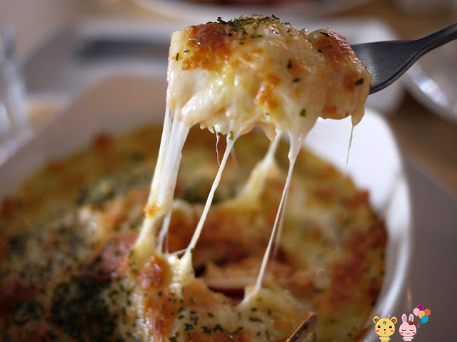 韓式泡菜海鮮焗飯的起司,給的非常多,只能說起司好像不用錢似的...有些誇張,用叉子輕輕挖起時,整各焗烤後的起司,綿綿不斷的牽起絲來,內層的香氣也逐漸散發出來,我很喜歡這各味道。