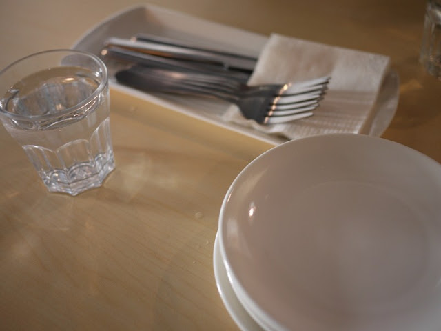 點完餐後,服務生會替我們擺上水、盤子與餐具。