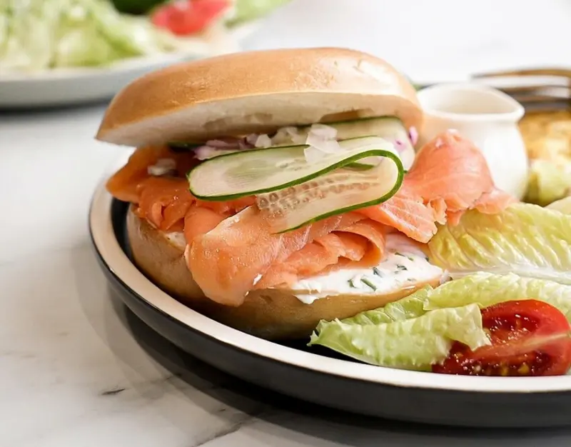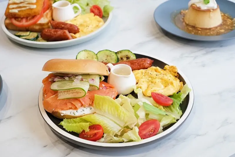 樂樂大力推薦他們的「乳酪鮭魚貝果」喔,聽說那個乳酪醬給得超級厚實又濃郁,完全就是塗好塗滿那種,再搭配上給得很大方的燻鮭魚,一口咬下去真的是太滿足,旁邊還附上了新鮮的美生菜、香噴噴的炒蛋、清爽的節瓜跟好吃的德國香腸,整個擺盤看起來就超豐富的。