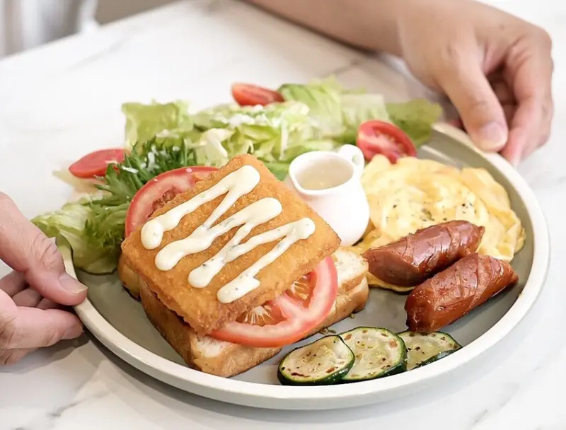 另外一個不能錯過的就是「塔塔醬炸魚排拼盤」啦!那個布里歐堡裡面夾著酥脆的炸魚排,還有新鮮的番茄跟濃郁的起司,吃起來一點都不會覺得油膩,反而很清爽喔,再加上炒蛋、德式香腸,還有滿滿的生菜,這一份吃下去保證超飽足又超滿足。
