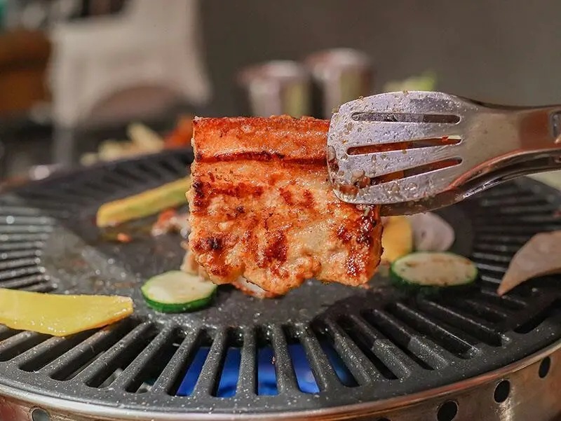 他們家的肉品選擇真的很多,有雞肉、豬肉、牛肉各種口味都有,不管你喜歡吃原味的,還是喜歡蒜味很濃的,甚至是辣味的刺激感,「肉大叔」都幫你準備好了!吃韓式燒肉當然不能錯過厚切豬五花啦,肉一下烤盤「滋滋」作響,那個肉香真的是太迷人了,蒜香口味的真的很讚,辣味更是他們家的招牌,一定要試試看!