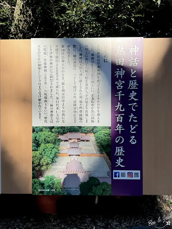 熱田神宮創建於 約1,900年前,是日本歷史悠久的神社之一。主祭神為 熱田大神,其神體便是天皇三大神器之一的「草薙劍」,與天照大神息息相關,使熱田神宮擁有極崇高的地位。