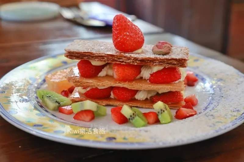 台南安平La Belle Maison Cafe法國鬍子傳統手工甜品咖啡餐廳家的甜點不便宜,但每一道都很好吃!法式草莓拿破崙千層,旁邊會有不同水果作為搭襯,手作的風味絕倫,喜歡都可以試試看。