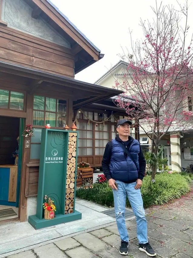 臺灣木材故事館館外有著櫻花樹當花開時增添濃烈日式風情