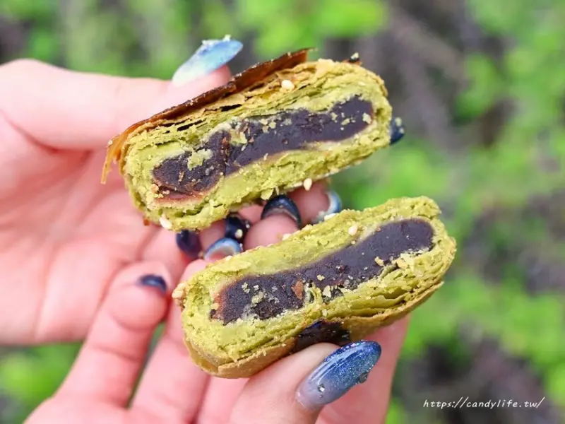外皮是綠色的,入口帶有淡雅的抹茶清香,中間紅豆沙餡口感綿密,微甜不膩,除了鹽之花的微鹹滋味,還多了白芝麻的香氣,層次相當豐富