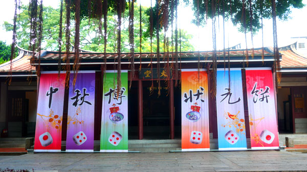 聯成廣東粥位於金門總兵署旁,這趟回去剛好是中秋博狀元餅活動,所以在總兵署的內部,掛上了大大的文宣,從門口遠遠看過去,還蠻酷的。