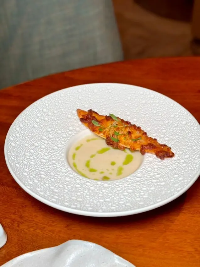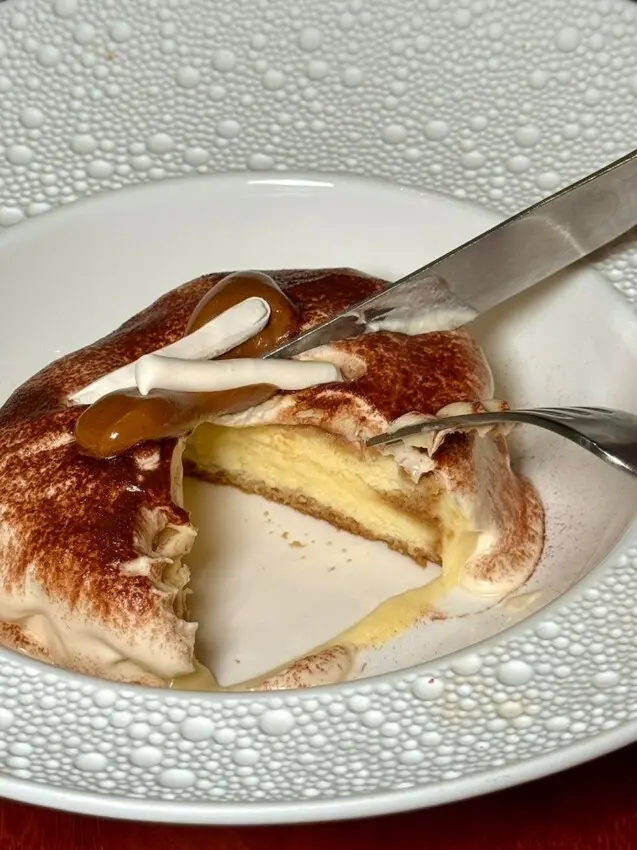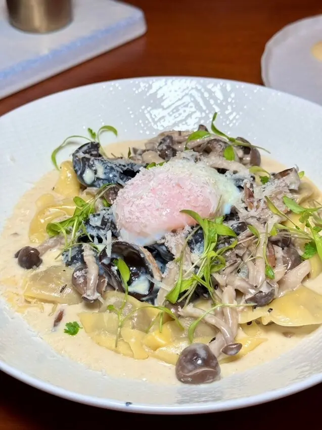 在來進到主餐的部分,這個肚臍餃我很喜歡!肚臍餃內還有包著野菇,吃起來很有口感,整體奶香濃郁,涼掉也還滿好吃的,上方的水波但也超加分,是我下次還會想回購得品項