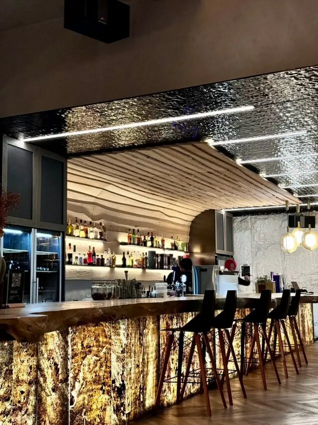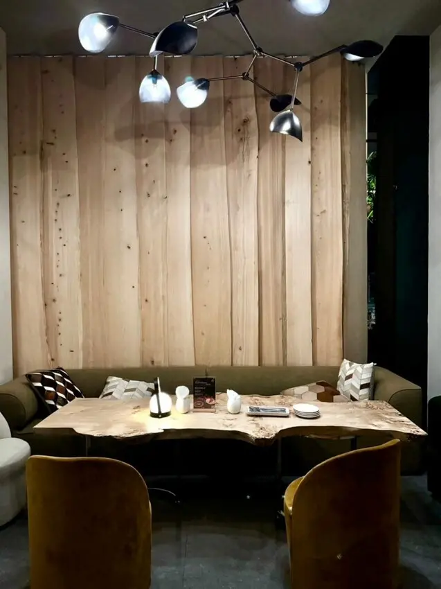 選用大量原木素材作為裝潢的主基調。迎賓門面,是一座壯觀的原木吧檯,保留了原木的自然邊,讓人立即代入如詩想要呈現的氛圍中。