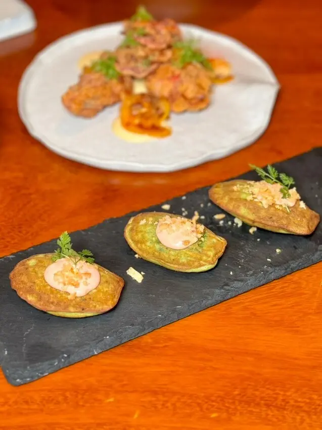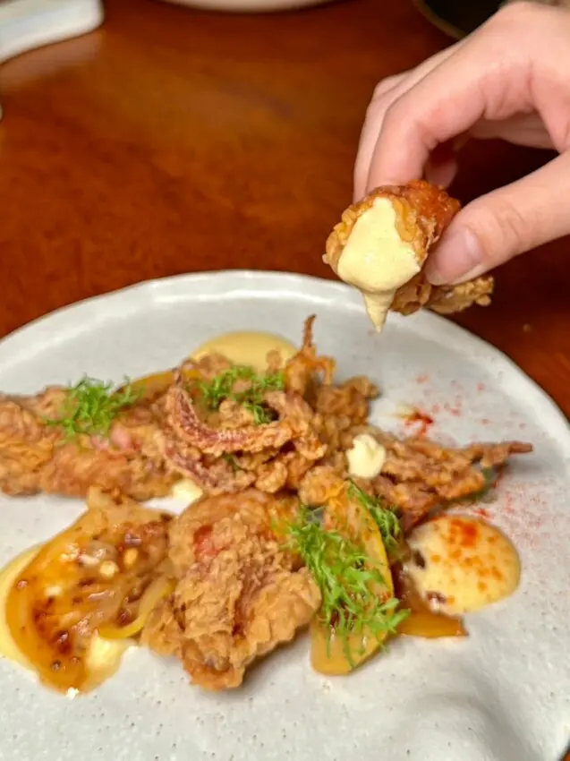 個人很愛的一道料理,酥炸小卷包裹著大蒜蛋黃醬,一口咬下相當滿足,旁邊還有搭配不同的佐料可以一起品嘗