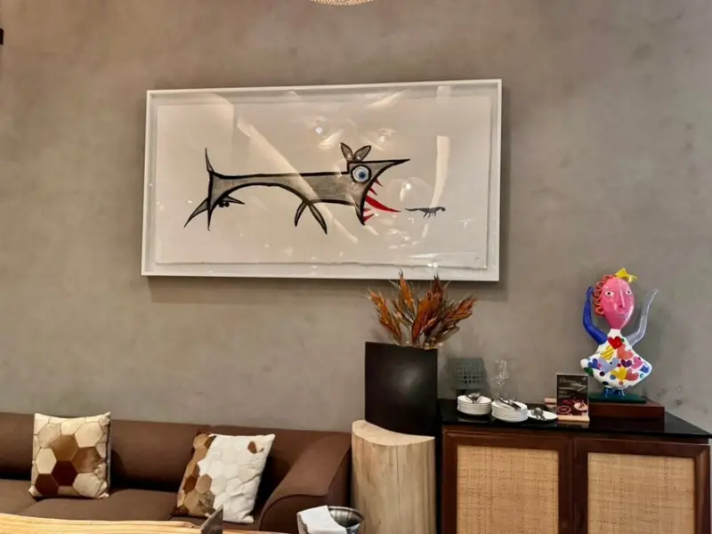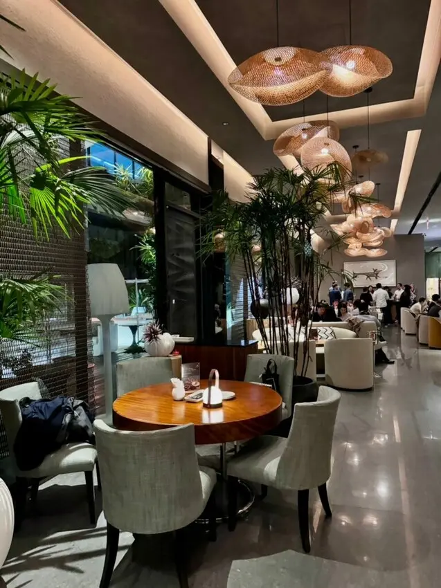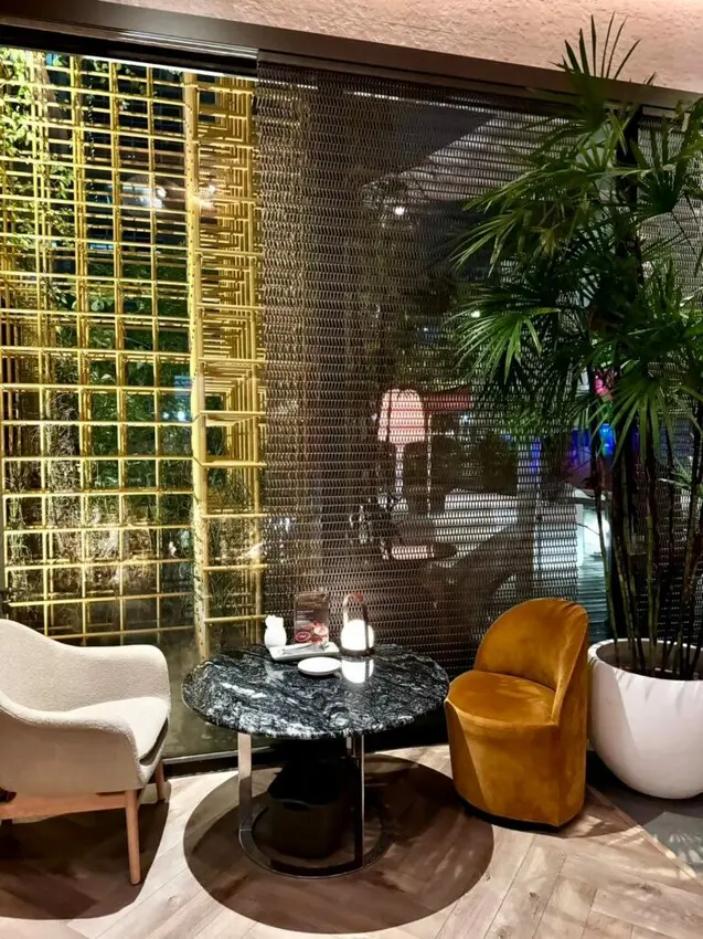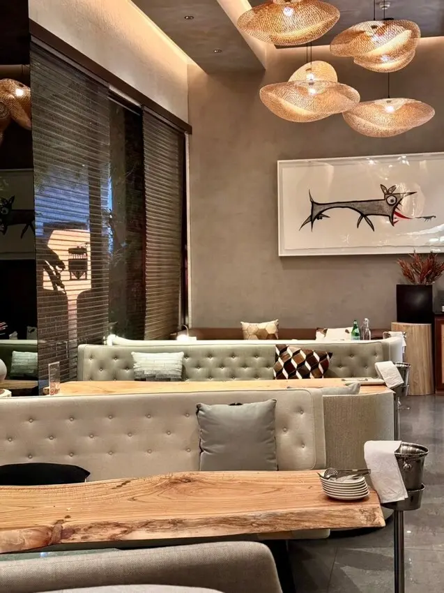 座位區上方的燈罩非常吸引我,怎麼拍都很漂亮,Pearl 是一個受古代日本燈籠啟發的燈具系列。乳白玻璃燈籠形狀的光源半隱藏在金屬燈罩後面,帶有孔洞的金屬燈罩使光線可穿透,也可自行翻轉以創造獨特的照明裝置。燈罩安裝在光滑的金屬框架上,為燈具增添了一定的輕盈感。