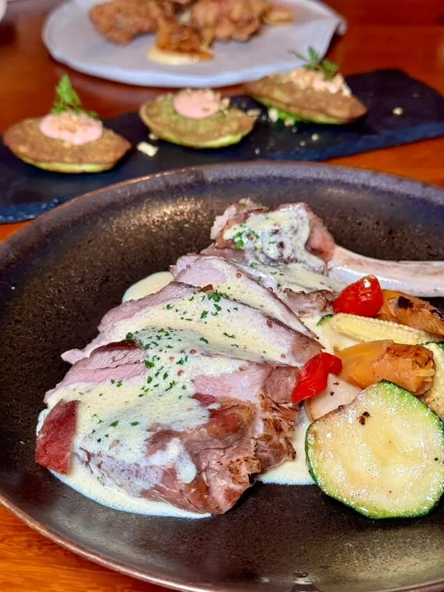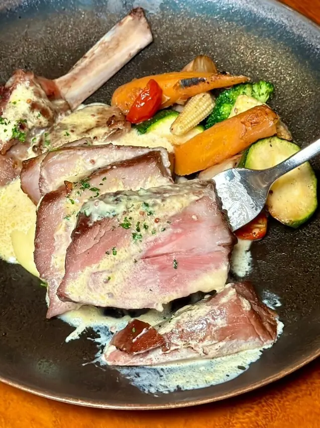 低溫熟成的伊比利戰斧豬排,看看這粉嫩肉質就令人口水直流~還有白松露芥末奶醬,整個高級感就出來了!份量還滿多的可以跟朋友一起分食享用