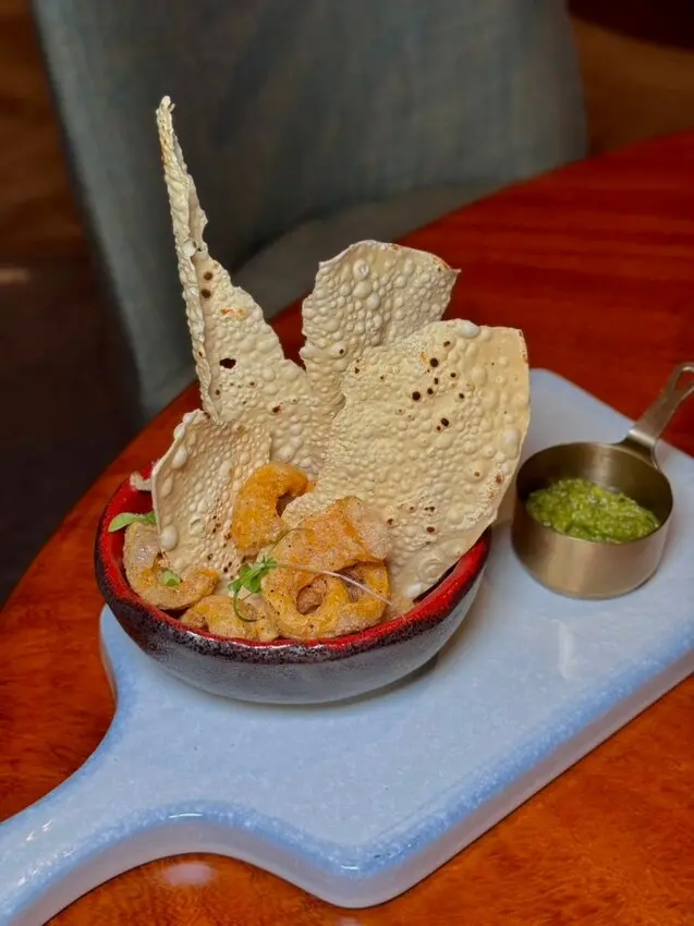 這道也屬於開胃小點的部分,脆片單吃會有點鹹,可配上旁邊的奇米奇羅辣醬(有點像墨西哥風的莎莎醬),豬皮可以當聊天時的小零嘴吃