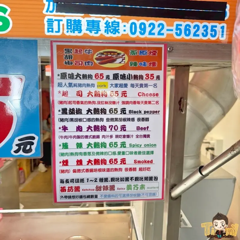 他們招牌產品是原味大熱狗65或原味小熱狗35元,另外大熱狗還有起司.黑胡椒.牛肉.蔥辣.煙燻口味(價格也有所不同) 買熱狗可以任選1~3種醬料,分別是蕃茄醬.甜辣醬.黃芥末等。