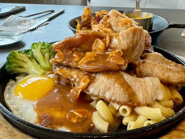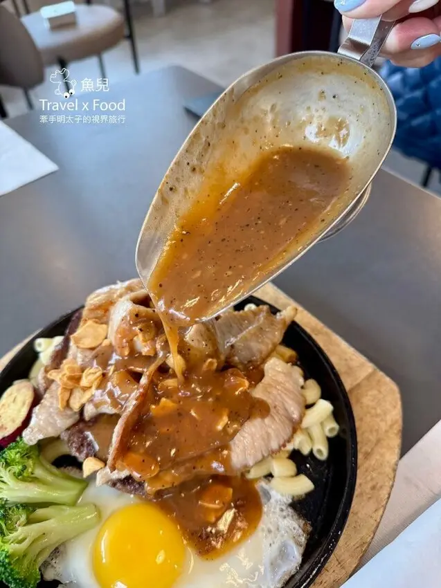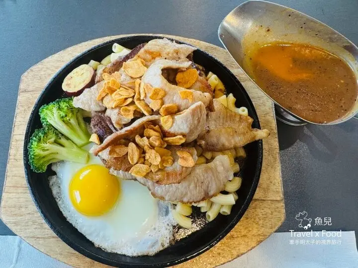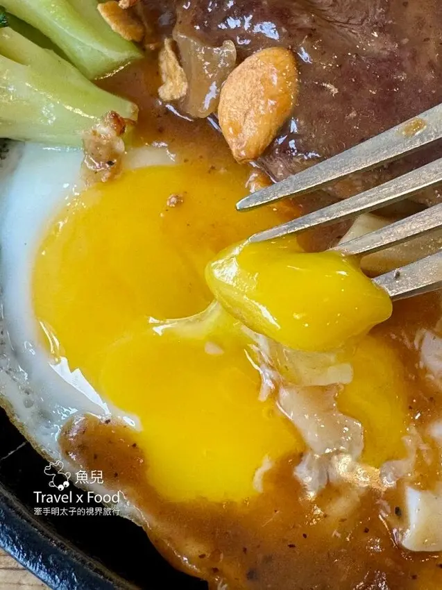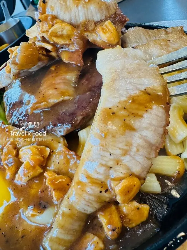二種肉堆疊在一起,在視覺上就己經是享受了,黃金雞腿排比板腱牛來得厚實,鮮嫩口感大獲好評。