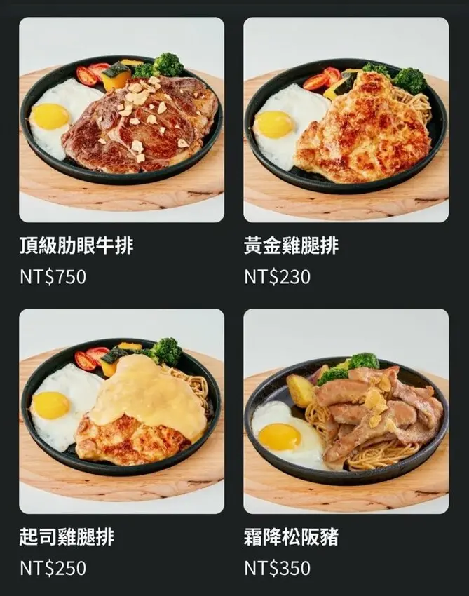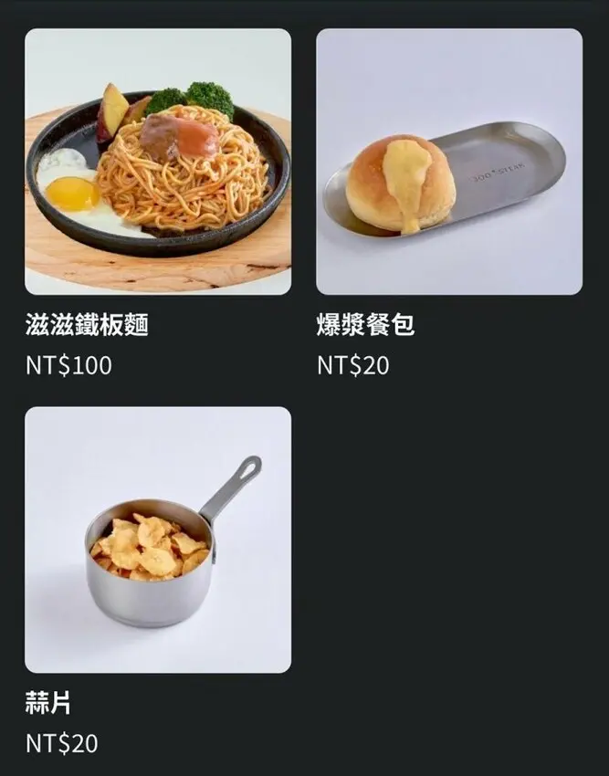 300°STEAK 使用QR CODE線上點餐,提供8-10種排餐、點心以及數款酒品,最特別的是能做雙拼組合,相較一般連鎖牛排館略有不同,價格範圍也較大。