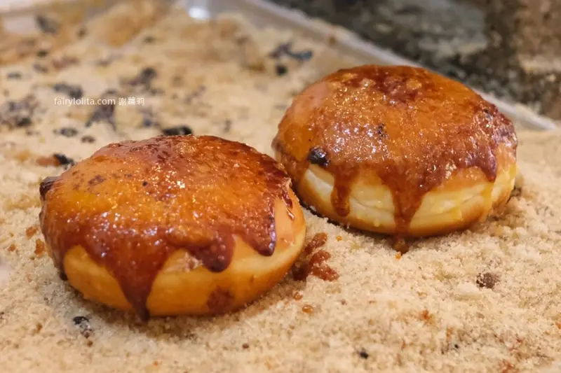 我買了兩個原味、很幸運還有撿到最後一顆燒糖起司乳酪,我覺得兩種都很好吃,原味吃起來焦糖滋味很鮮明,苦糖而帶有韻味,甜甜圈本身相當澎鬆,而有帶餡的則是超爆餡,一咬下去滿滿都是起司乳酪醬,我覺得有包餡的更好吃。