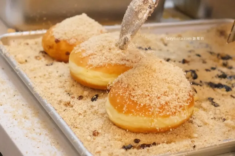 甜甜圈上面覆蓋著一層剛烤好的焦脆,用手敲還可以敲出聲音來,光看就覺得很酥脆。