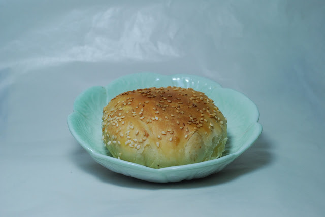 而鹹的燒餅則是扁圓形的,由於裡面包的內餡有肉,吃起來的口感較為紮實,可能熊是肉食主義的關係,個人比較偏愛鹹燒餅,一般熊如果將燒餅帶去台灣時,一定會把燒餅先放在冰箱冷藏,等到要吃時再拿去烤箱烤,風味依然不錯,只是要注意千萬別烤太久否則外皮會烤焦喔XD,最後要提醒的是,根據以往經驗來看,如果要買這家的燒餅...記得先預約吧!