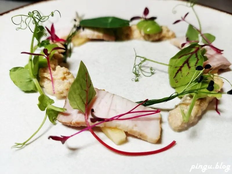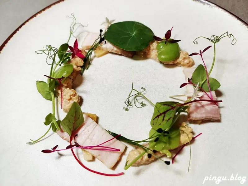 煙燻過的豬肉帶有獨特的香氣,肉質鮮嫩多汁,搭配精心調製的醬汁,風味十足,擺盤呈現花環狀,精緻且別緻~