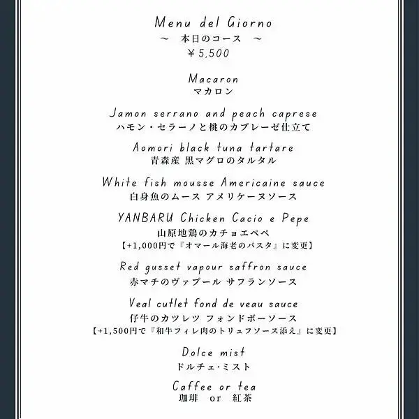 The DINER的菜單以套餐和單點為主,套餐價格從5500円~8000円,每個價位的套餐都包含了多道色香味俱佳的菜肴。其中5500円的套餐被譽為餐廳的招牌,套餐共包含8道精選菜品,細膩的擺盤和豐富的口感,讓每一位食客都留下深刻的印象~