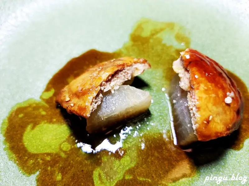 沒想到可以吃到這麼肥美的鵝肝,下方是多汁的燉白蘿蔔,可綜合鵝肝的油膩,讓口感變得清爽且美味~