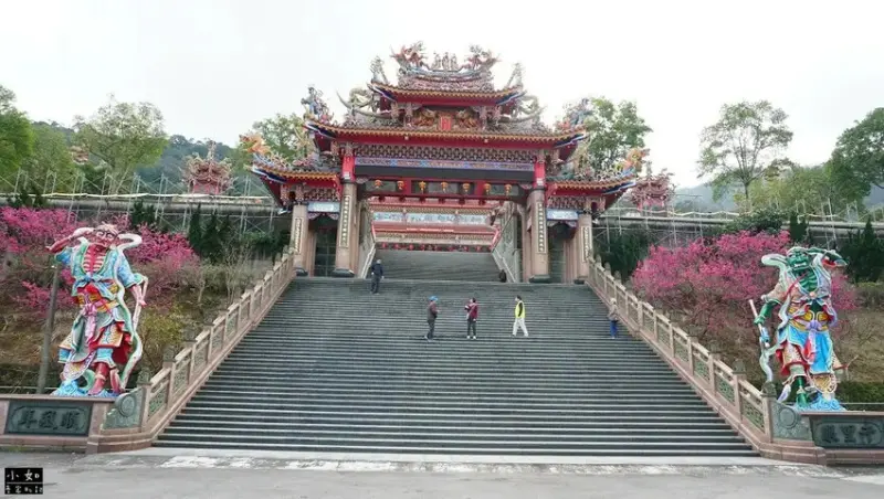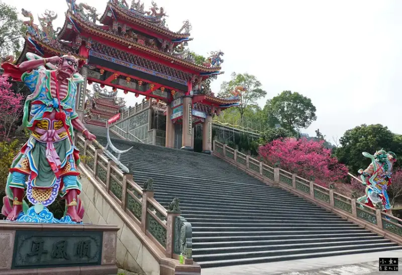 三峽紫薇天后宮,兩側櫻花盛開,左右有順風耳、千里眼,