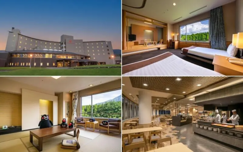 阿蘇火山住宿推薦住哪?想在房間裡看阿蘇山美景,還能泡溫泉、吃大餐?這間龜之井酒店完全滿足你的願望!飯店空間寬敞,提供一泊二食方案,晚餐自助餐有松葉蟹、牛排、生魚片,居然還有消夜,完全不怕餓著!大浴場超放鬆,天氣好時還能在大片草原上玩耍。開車10分鐘就有超市和藥妝店,機能不錯,是造訪阿蘇火山的絕佳住宿選擇!